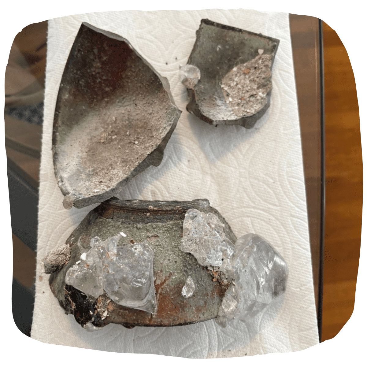 My husband and I sadly lost our home during the LA fires of January 2025, and while sifting through rubble a few weeks later, we came across a few large pieces of the bowl.